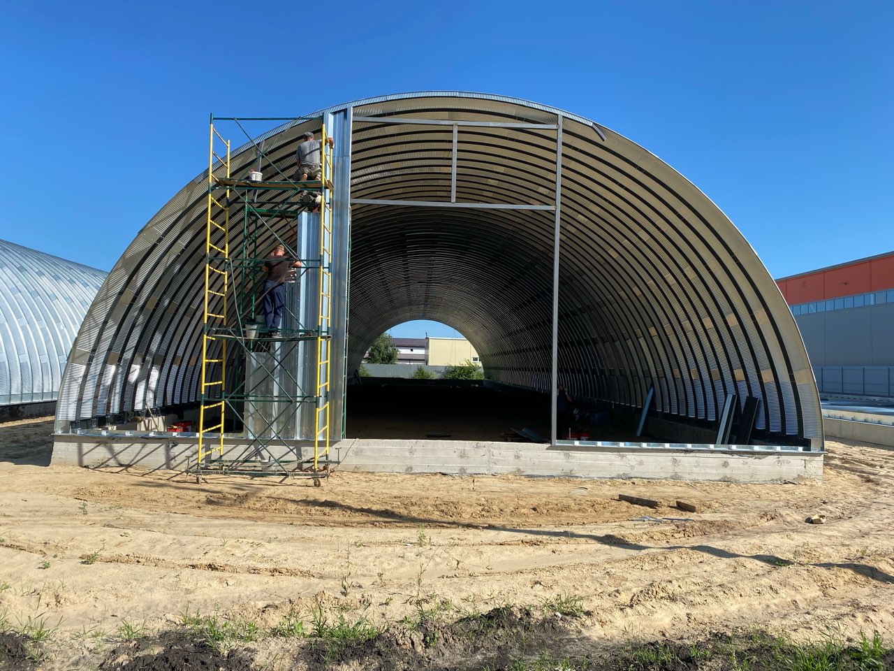 Торцевые стороны разборных ангаров аналогично куполу имеют модульное строение, в которых по желанию и требованиям заказчика может быть установлен широкий выбор разнообразных проемов, ворот, дверей и окон. Торцевые стороны имеют болтовое сочленение элементов и самонесущее строение.