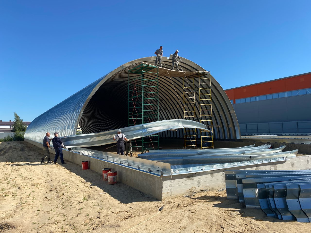 Процесс сборки купола разборных бескаркасных ангарных ангаров внешне очень напоминает всем знакомые конструкторы из нашего детства, делая ее доступной для широкого круга людей, не имеющих специального строительного образования. Весь процесс сборки происходит «на земле» и только уже собранные арки закрепляются в основание ангара, тем самым дополнительно облегчая процесс сборки. Сборка и установка купола ангара, используя только болтовые соединения, позволяет уже в процессе эксплуатации менять размеры ангара как большую, так и меньшую сторону, модульно достаивая (убирая) необходимую длину, что делает данный вариант непревзойдённым по своим эксплуатационным качествам, которые отвечают требованиям реального времени.