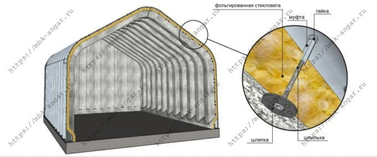 Если в процессе эксплуатации или первоначально при заказе ангара у Вас стоит задача в теплом исполнении ангара, то с разборными арочными ангарами у Вас никогда не будет проблем или сложностей. Компания дополнительно реализует несколько видов крепежных элементов для утепления ангара, монтаж которых удивляет своей легкостью, используя те же болтовые соединения, что и купол ангара. Разборные Ангары могут быть утеплены практически любым из ныне доступных средств и материалов как гибкой, так и не гибкой структуры. Особенности эксплуатации и требования к температурному режиму зачастую сами подсказывают выбор вида утеплителя для ангара.